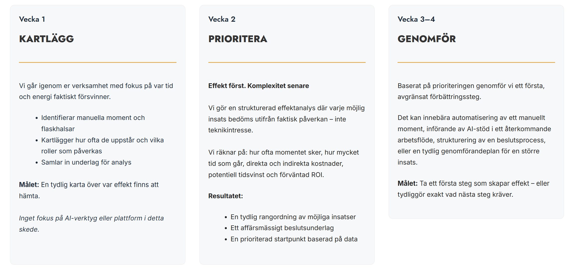 Det här är exakt den process jag följer i en AI Effektanalys – tre steg på 30 dagar, med ett fast pris och ett tydligt resultat. Vecka 1 kartlägger vi, vecka 2 prioriterar vi, vecka 3–4 genomför vi. Ni lämnar inte med en rapport för arkivet – ni lämnar med en startpunkt som redan skapar effekt.